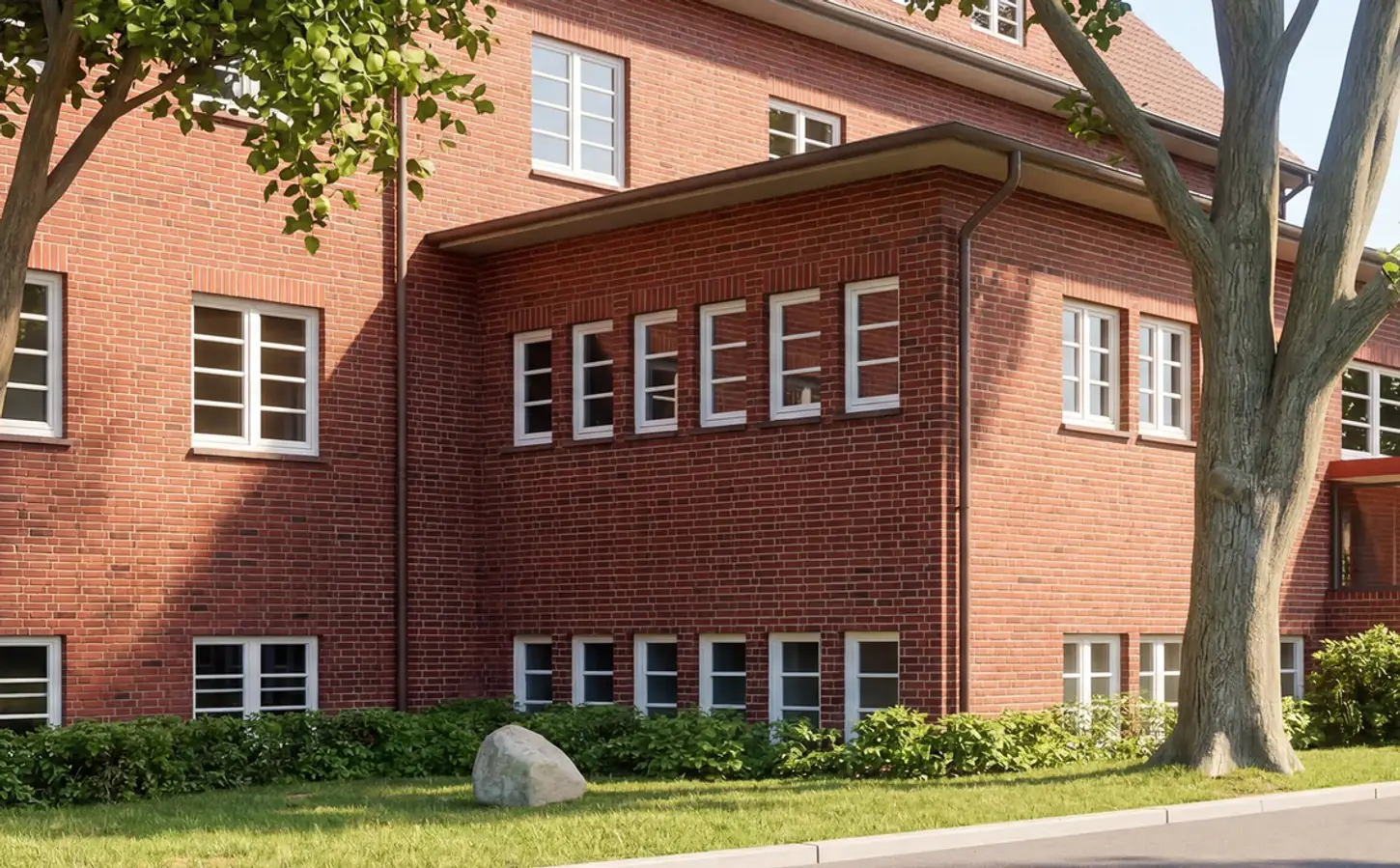 Beim Bauprojekt Grundschule Strenge, Hamburg, wurde eine denkmalgerechte Sanierung des historischen Bestandsgebäudes inklusive Rettungsweg und Treppen sowie Mensa‑ und Klassen‑/Verwaltungserweiterung überwacht. Parallel entstand eine neue Zweifeld‑Sporthalle mit Vorschulklassentrakt. Der L‑förmige Baukörper wird in dunkelrotem Klinker im märkischen/wendischen Verband ausgeführt, mit einer Aula als optischem Schwerpunkt und Flachdächern für die Erweiterungsbauten; beide Hallenteile funktionieren autark.